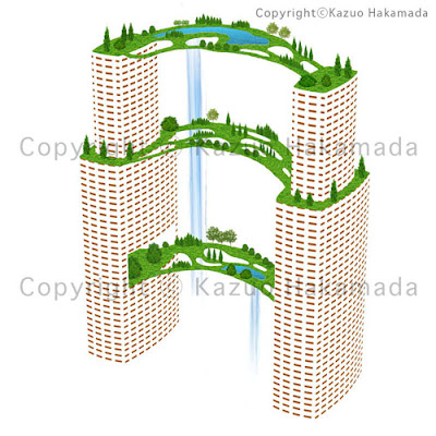 ビルや都会の単純化イメージと緑や自然とのシンボルイラスト